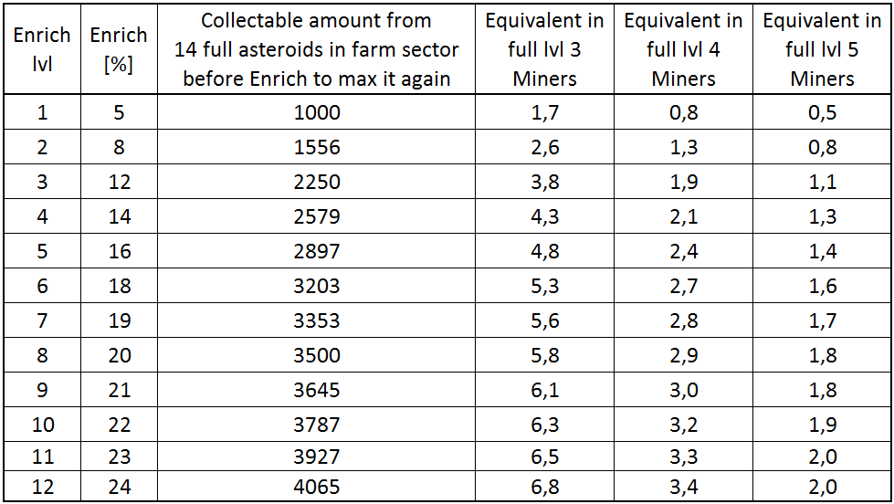 "If I have Enrich lvl 5, and use it on the same sector every day 12 days long, it will add about 1320 gas on the 13-th day, i.e. one full Miner level 4, or two full Miners level 3.";